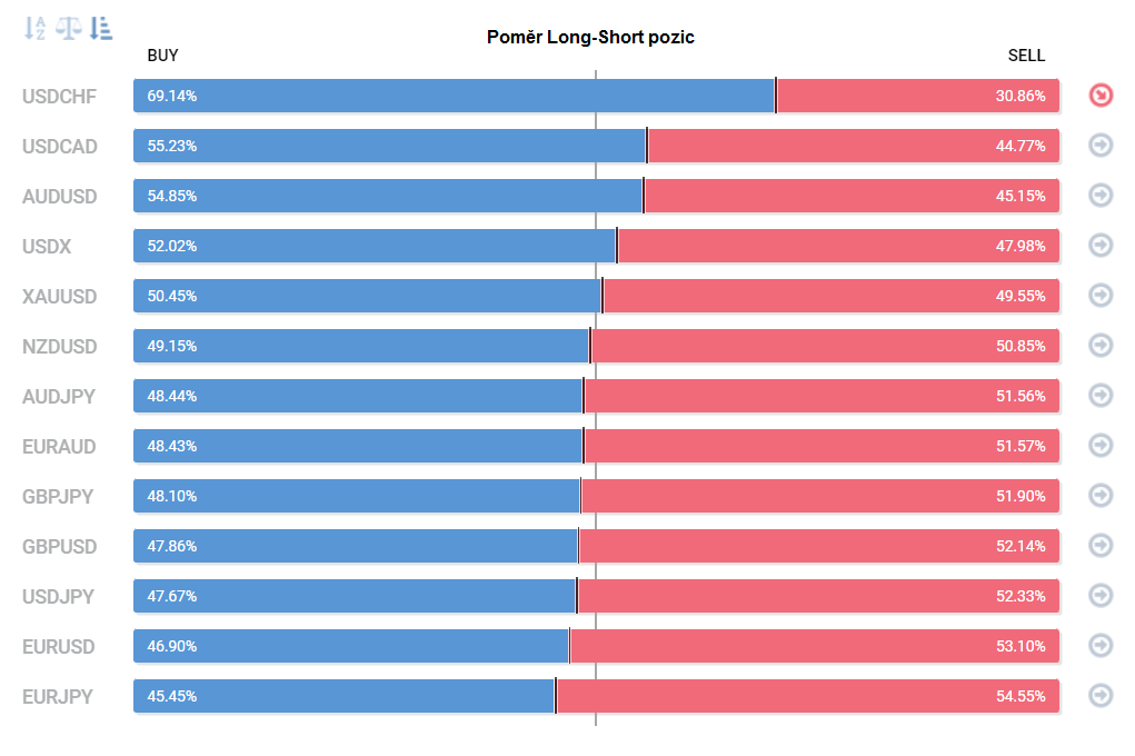 Přinášíme pohled na aktuálně otevřené pozice retailových obchodníků (běžných traderů) na forexu. Jde o reverzní - contrarian indikátor, který pokud naznačuje velkou míru short pozic, tak to může znamenat další pokračování v růstu (a naopak). Je to z důvodu předpokladu, že trh půjde proti retailu, který se většinu času snaží jít proti trendu. -