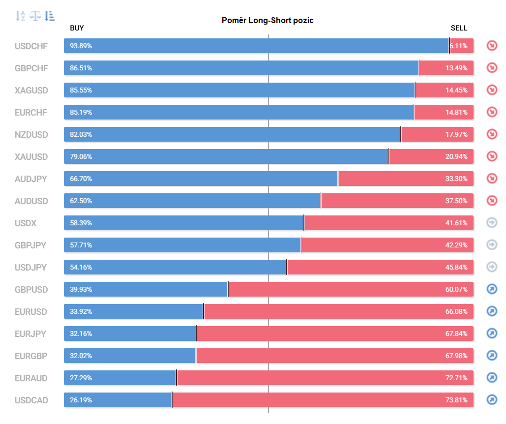 Přinášíme pohled na aktuálně otevřené pozice retailových obchodníků (běžných traderů) na forexu. Jde o reverzní - contrarian indikátor, který pokud naznačuje velkou míru short pozic, tak to může znamenat další pokračování v růstu (a naopak). Je to z důvodu předpokladu, že trh půjde proti retailu, který se většinu času snaží jít proti trendu.