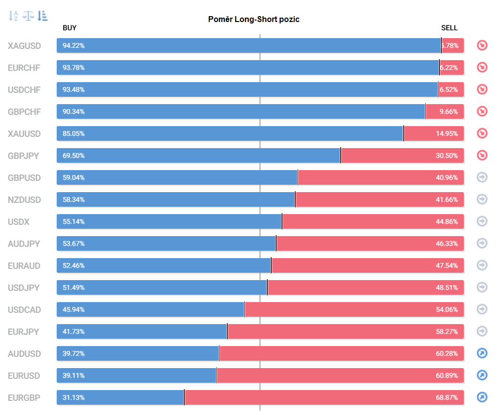 Přinášíme pohled na aktuálně otevřené pozice retailových obchodníků (běžných traderů) na forexu. Jde o reverzní - contrarian indikátor, který pokud naznačuje velkou míru short pozic, tak to může znamenat další pokračování v růstu (a naopak). Je to z důvodu předpokladu, že trh půjde proti retailu, který se většinu času snaží jít proti trendu.