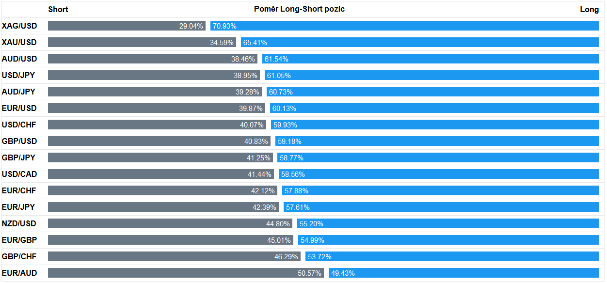 Přinášíme pohled na aktuálně otevřené pozice retailových obchodníků (běžných traderů) na forexu. Jde o reverzní - contrarian indikátor, který pokud naznačuje velkou míru short pozic, tak to může znamenat další pokračování v růstu (a naopak). Je to z důvodu předpokladu, že trh půjde proti retailu, který se většinu času snaží jít proti trendu. -