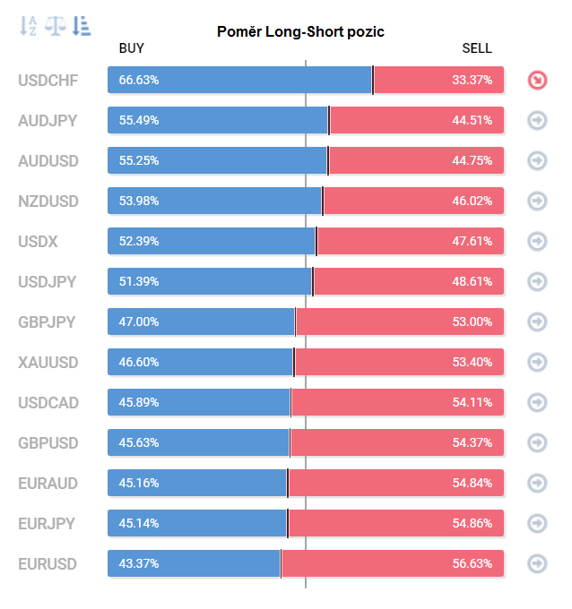 Přinášíme pohled na aktuálně otevřené pozice retailových obchodníků (běžných traderů) na forexu. Jde o reverzní - contrarian indikátor, který pokud naznačuje velkou míru short pozic, tak to může znamenat další pokračování v růstu (a naopak). Je to z důvodu předpokladu, že trh půjde proti retailu, který se většinu času snaží jít proti trendu.
