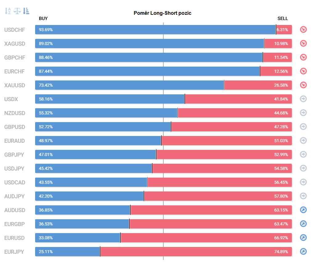 Přinášíme pohled na aktuálně otevřené pozice retailových obchodníků (běžných traderů) na forexu. Jde o reverzní - contrarian indikátor, který pokud naznačuje velkou míru short pozic, tak to může znamenat další pokračování v růstu (a naopak). Je to z důvodu předpokladu, že trh půjde proti retailu, který se většinu času snaží jít proti trendu.