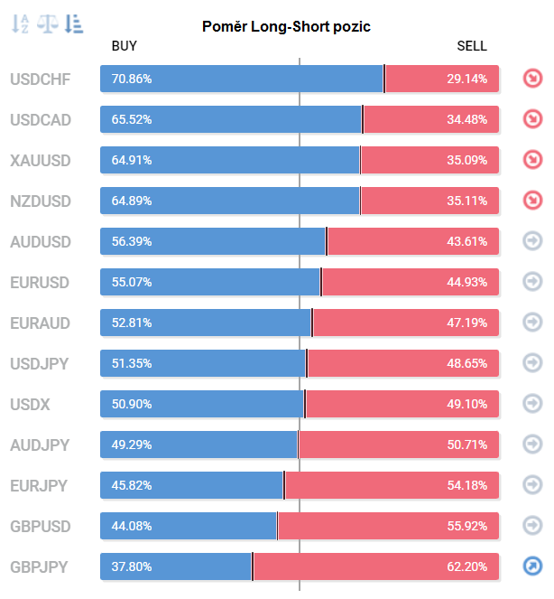 Přinášíme pohled na aktuálně otevřené pozice retailových obchodníků (běžných traderů) na forexu. Jde o reverzní - contrarian indikátor, který pokud naznačuje velkou míru short pozic, tak to může znamenat další pokračování v růstu (a naopak). Je to z důvodu předpokladu, že trh půjde proti retailu, který se většinu času snaží jít proti trendu.