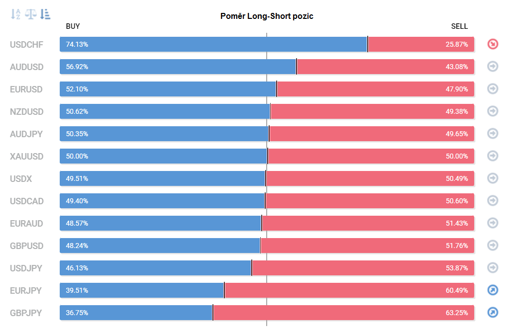 Přinášíme pohled na aktuálně otevřené pozice retailových obchodníků (běžných traderů) na forexu. Jde o reverzní - contrarian indikátor, který pokud naznačuje velkou míru short pozic, tak to může znamenat další pokračování v růstu (a naopak). Je to z důvodu předpokladu, že trh půjde proti retailu, který se většinu času snaží jít proti trendu. -