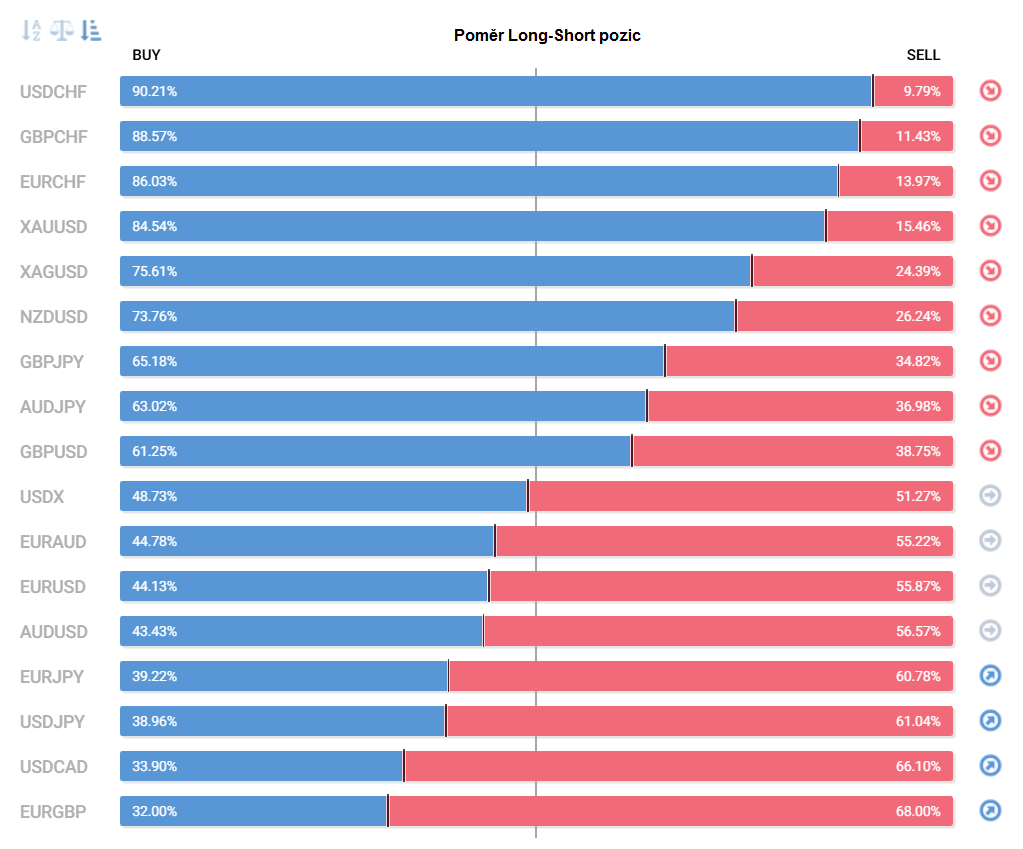 Přinášíme pohled na aktuálně otevřené pozice retailových obchodníků (běžných traderů) na forexu. Jde o reverzní - contrarian indikátor, který pokud naznačuje velkou míru short pozic, tak to může znamenat další pokračování v růstu (a naopak). Je to z důvodu předpokladu, že trh půjde proti retailu, který se většinu času snaží jít proti trendu.