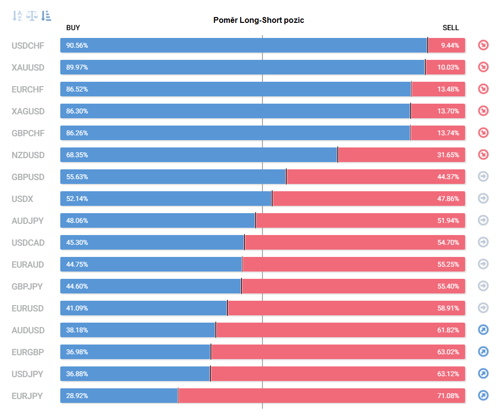 Přinášíme pohled na aktuálně otevřené pozice retailových obchodníků (běžných traderů) na forexu. Jde o reverzní - contrarian indikátor, který pokud naznačuje velkou míru short pozic, tak to může znamenat další pokračování v růstu (a naopak). Je to z důvodu předpokladu, že trh půjde proti retailu, který se většinu času snaží jít proti trendu.