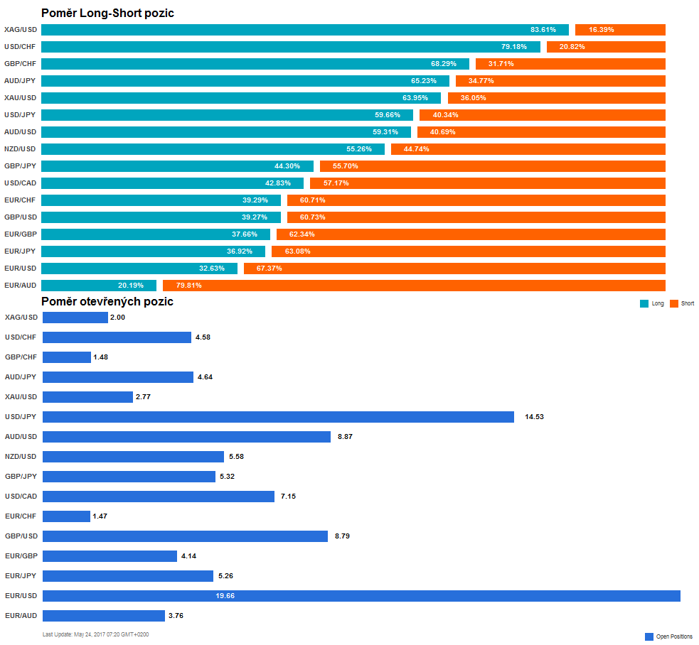 Přinášíme pohled na aktuálně otevřené pozice retailových obchodníků (běžných traderů) na forexu. Jde o reverzní - contrarian indikátor, který pokud naznačuje velkou míru short pozic, tak to může znamenat další pokračování v růstu (a naopak). Je to z důvodu předpokladu, že trh půjde proti retailu, který se většinu času snaží jít proti trendu. -