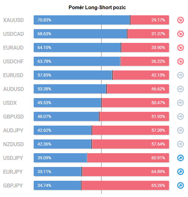 Přinášíme pohled na aktuálně otevřené pozice retailových obchodníků (běžných traderů) na forexu. Jde o reverzní - contrarian indikátor, který pokud naznačuje velkou míru short pozic, tak to může znamenat další pokračování v růstu (a naopak). Je to z důvodu předpokladu, že trh půjde proti retailu, který se většinu času snaží jít proti trendu.