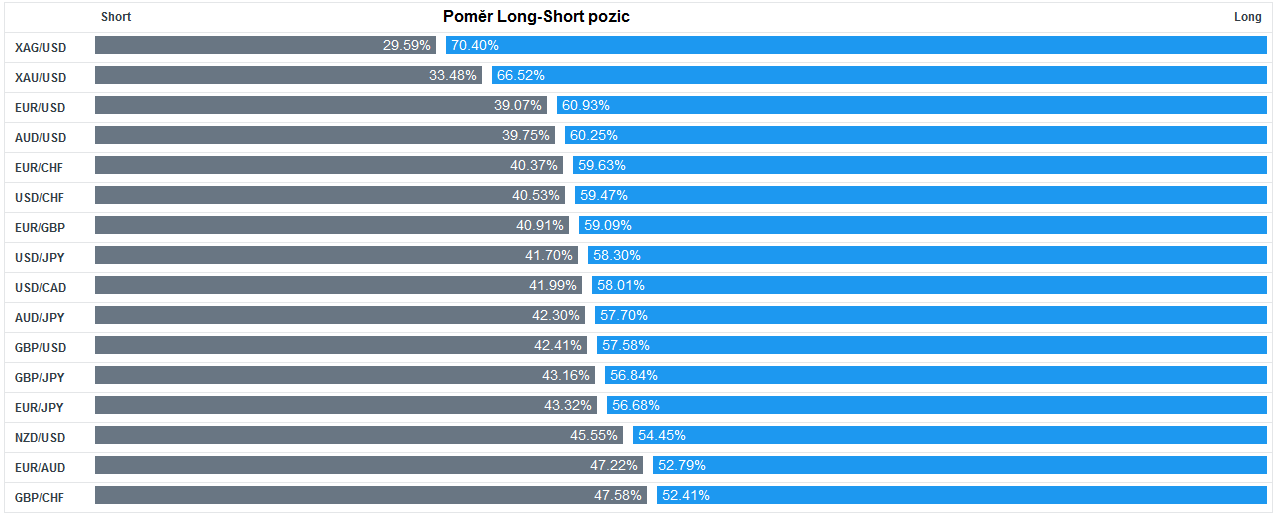 Přinášíme pohled na aktuálně otevřené pozice retailových obchodníků (běžných traderů) na forexu. Jde o reverzní - contrarian indikátor, který pokud naznačuje velkou míru short pozic, tak to může znamenat další pokračování v růstu (a naopak). Je to z důvodu předpokladu, že trh půjde proti retailu, který se většinu času snaží jít proti trendu.