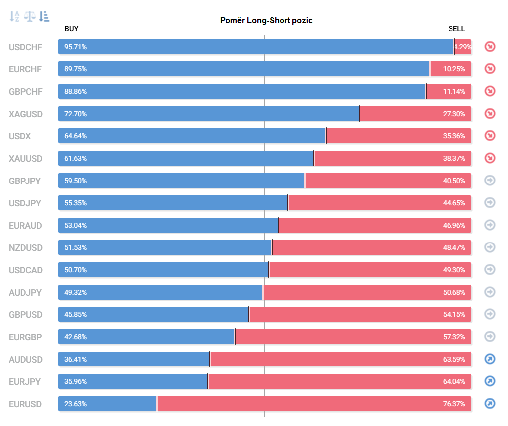 Přinášíme pohled na aktuálně otevřené pozice retailových obchodníků (běžných traderů) na forexu. Jde o reverzní - contrarian indikátor, který pokud naznačuje velkou míru short pozic, tak to může znamenat další pokračování v růstu (a naopak). Je to z důvodu předpokladu, že trh půjde proti retailu, který se většinu času snaží jít proti trendu.