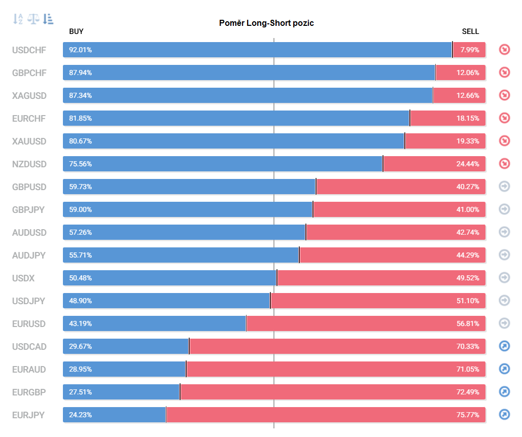 Přinášíme pohled na aktuálně otevřené pozice retailových obchodníků (běžných traderů) na forexu. Jde o reverzní - contrarian indikátor, který pokud naznačuje velkou míru short pozic, tak to může znamenat další pokračování v růstu (a naopak). Je to z důvodu předpokladu, že trh půjde proti retailu, který se většinu času snaží jít proti trendu.