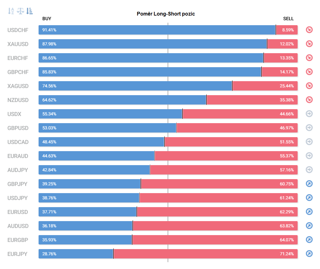 Přinášíme pohled na aktuálně otevřené pozice retailových obchodníků (běžných traderů) na forexu. Jde o reverzní - contrarian indikátor, který pokud naznačuje velkou míru short pozic, tak to může znamenat další pokračování v růstu (a naopak). Je to z důvodu předpokladu, že trh půjde proti retailu, který se většinu času snaží jít proti trendu.