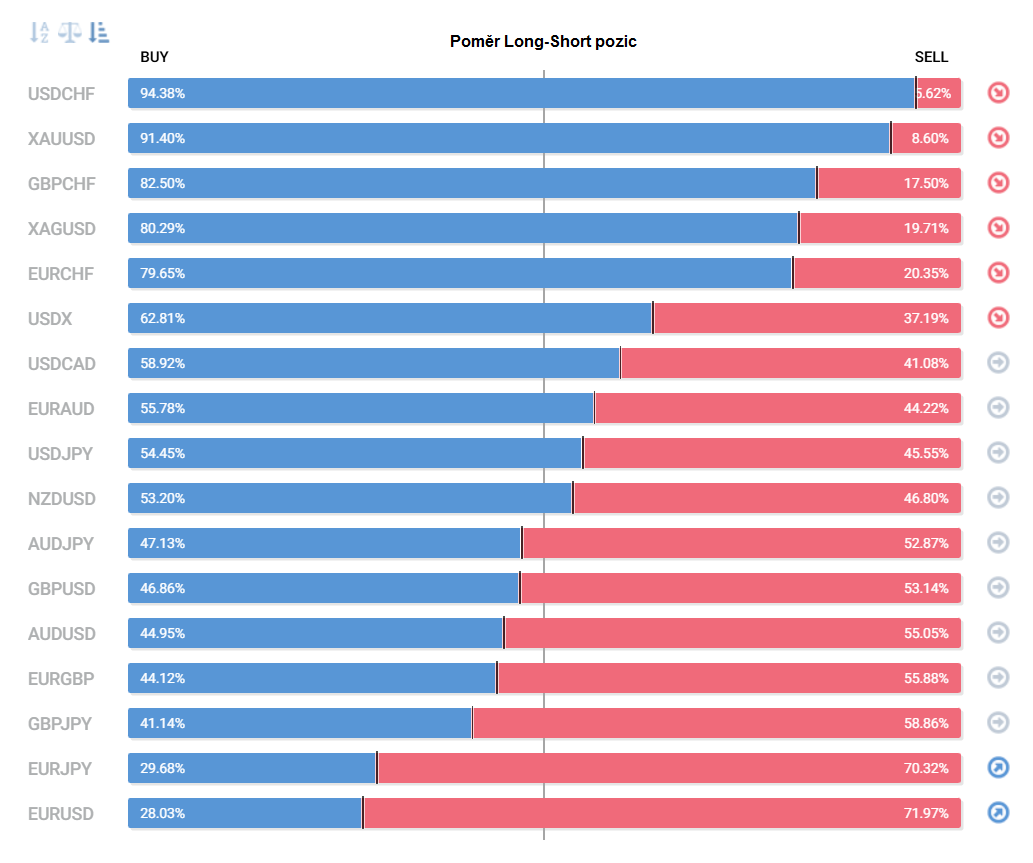 Přinášíme pohled na aktuálně otevřené pozice retailových obchodníků (běžných traderů) na forexu. Jde o reverzní - contrarian indikátor, který pokud naznačuje velkou míru short pozic, tak to může znamenat další pokračování v růstu (a naopak). Je to z důvodu předpokladu, že trh půjde proti retailu, který se většinu času snaží jít proti trendu. -