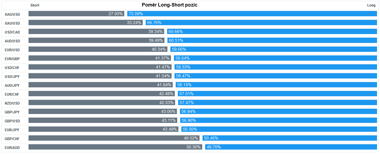 Přinášíme pohled na aktuálně otevřené pozice retailových obchodníků (běžných traderů) na forexu. Jde o reverzní - contrarian indikátor, který pokud naznačuje velkou míru short pozic, tak to může znamenat další pokračování v růstu (a naopak). Je to z důvodu předpokladu, že trh půjde proti retailu, který se většinu času snaží jít proti trendu.