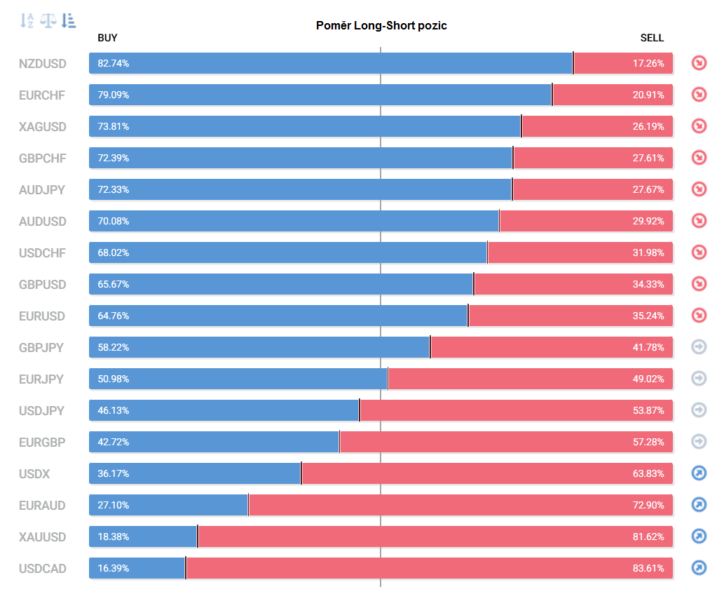 Přinášíme pohled na aktuálně otevřené pozice retailových obchodníků (běžných traderů) na forexu. Jde o reverzní - contrarian indikátor, který pokud naznačuje velkou míru short pozic, tak to může znamenat další pokračování v růstu (a naopak). Je to z důvodu předpokladu, že trh půjde proti retailu, který se většinu času snaží jít proti trendu.