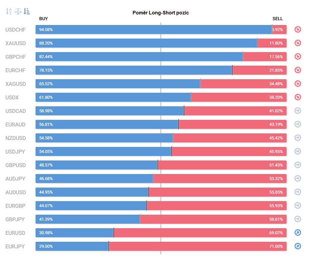 Přinášíme pohled na aktuálně otevřené pozice retailových obchodníků (běžných traderů) na forexu. Jde o reverzní - contrarian indikátor, který pokud naznačuje velkou míru short pozic, tak to může znamenat další pokračování v růstu (a naopak). Je to z důvodu předpokladu, že trh půjde proti retailu, který se většinu času snaží jít proti trendu.