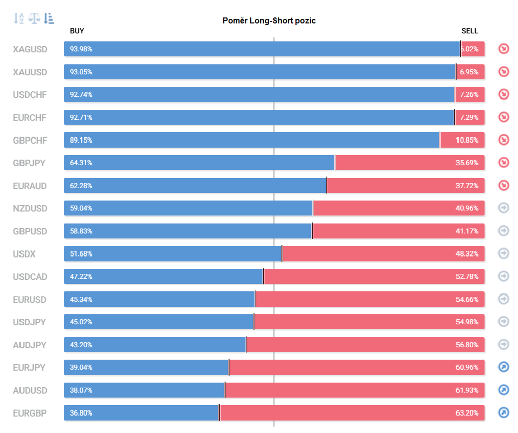 Přinášíme pohled na aktuálně otevřené pozice retailových obchodníků (běžných traderů) na forexu. Jde o reverzní - contrarian indikátor, který pokud naznačuje velkou míru short pozic, tak to může znamenat další pokračování v růstu (a naopak). Je to z důvodu předpokladu, že trh půjde proti retailu, který se většinu času snaží jít proti trendu.