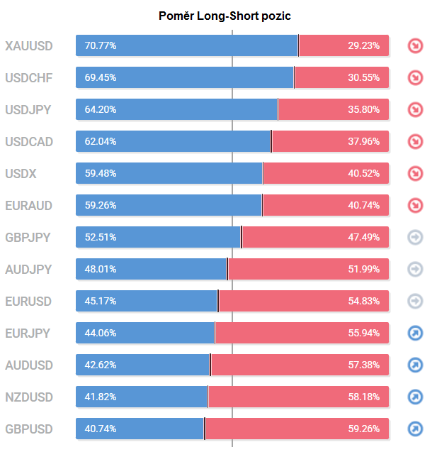 Přinášíme pohled na aktuálně otevřené pozice retailových obchodníků (běžných traderů) na forexu. Jde o reverzní - contrarian indikátor, který pokud naznačuje velkou míru short pozic, tak to může znamenat další pokračování v růstu (a naopak). Je to z důvodu předpokladu, že trh půjde proti retailu, který se většinu času snaží jít proti trendu.