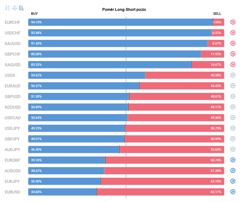 Přinášíme pohled na aktuálně otevřené pozice retailových obchodníků (běžných traderů) na forexu. Jde o reverzní - contrarian indikátor, který pokud naznačuje velkou míru short pozic, tak to může znamenat další pokračování v růstu (a naopak). Je to z důvodu předpokladu, že trh půjde proti retailu, který se většinu času snaží jít proti trendu. -