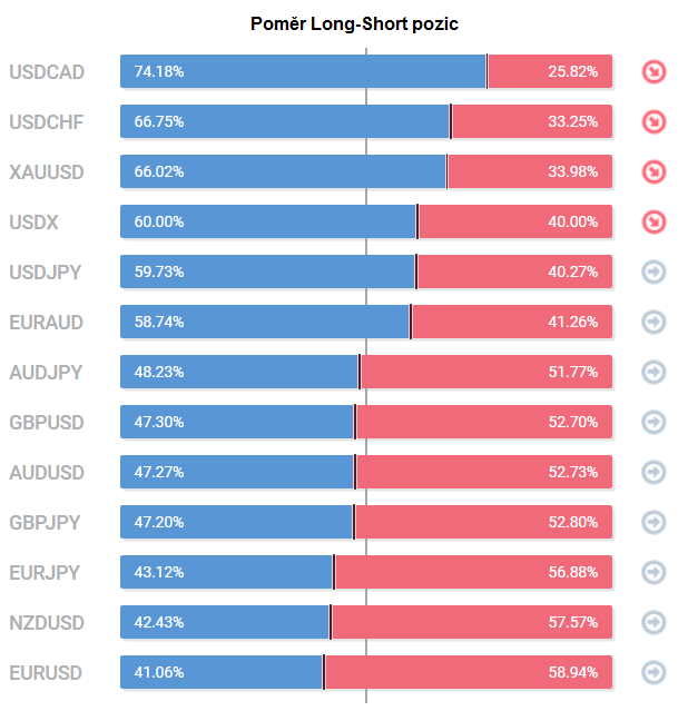 Přinášíme pohled na aktuálně otevřené pozice retailových obchodníků (běžných traderů) na forexu. Jde o reverzní - contrarian indikátor, který pokud naznačuje velkou míru short pozic, tak to může znamenat další pokračování v růstu (a naopak). Je to z důvodu předpokladu, že trh půjde proti retailu, který se většinu času snaží jít proti trendu.