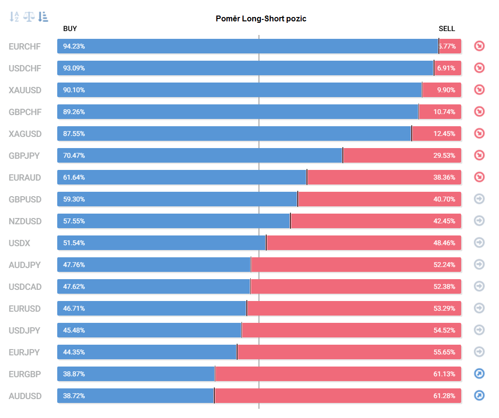 Přinášíme pohled na aktuálně otevřené pozice retailových obchodníků (běžných traderů) na forexu. Jde o reverzní - contrarian indikátor, který pokud naznačuje velkou míru short pozic, tak to může znamenat další pokračování v růstu (a naopak). Je to z důvodu předpokladu, že trh půjde proti retailu, který se většinu času snaží jít proti trendu.