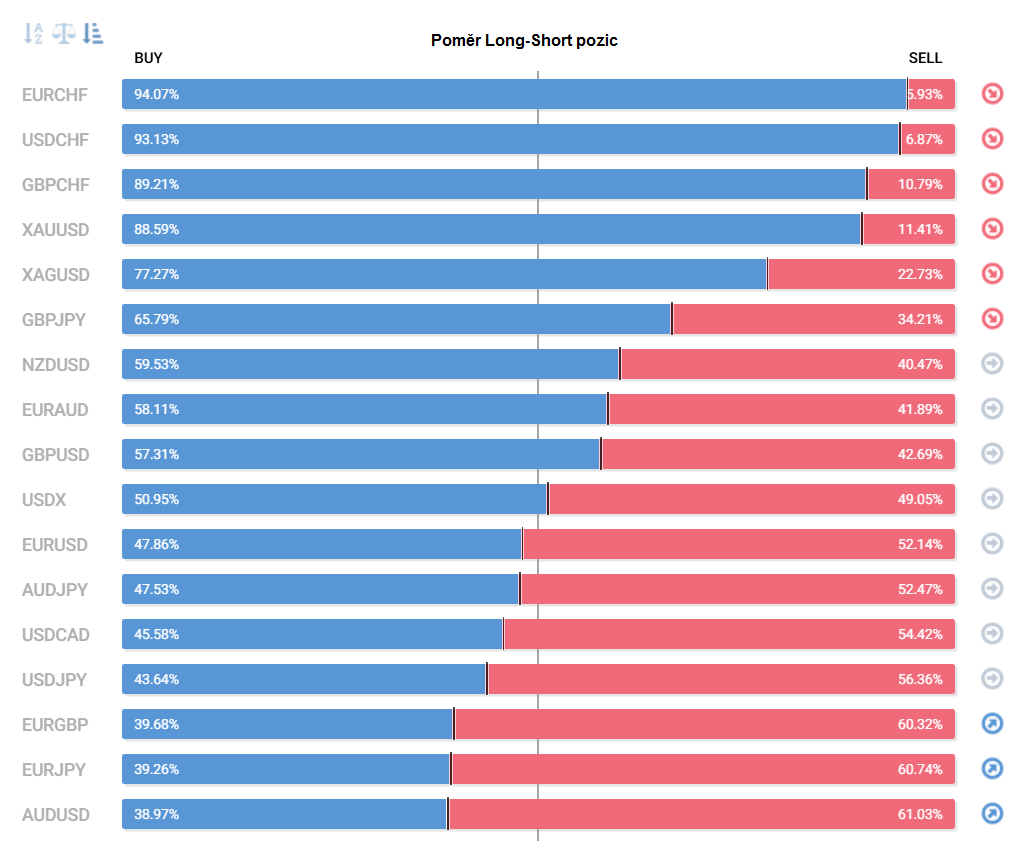 Přinášíme pohled na aktuálně otevřené pozice retailových obchodníků (běžných traderů) na forexu. Jde o reverzní - contrarian indikátor, který pokud naznačuje velkou míru short pozic, tak to může znamenat další pokračování v růstu (a naopak). Je to z důvodu předpokladu, že trh půjde proti retailu, který se většinu času snaží jít proti trendu.
