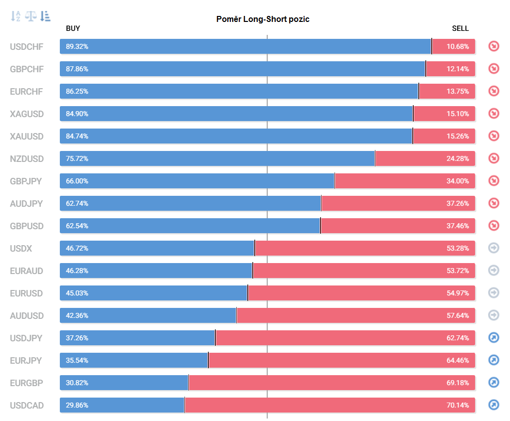 Přinášíme pohled na aktuálně otevřené pozice retailových obchodníků (běžných traderů) na forexu. Jde o reverzní - contrarian indikátor, který pokud naznačuje velkou míru short pozic, tak to může znamenat další pokračování v růstu (a naopak). Je to z důvodu předpokladu, že trh půjde proti retailu, který se většinu času snaží jít proti trendu.