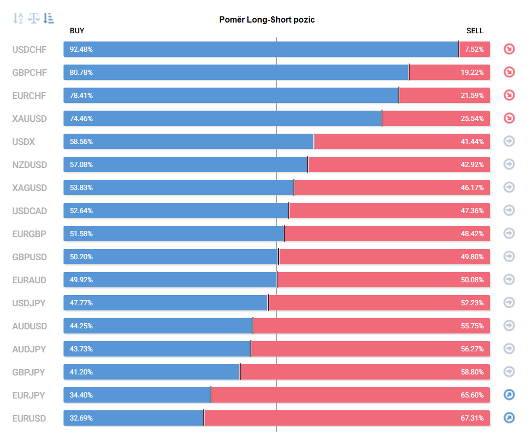 Přinášíme pohled na aktuálně otevřené pozice retailových obchodníků (běžných traderů) na forexu. Jde o reverzní - contrarian indikátor, který pokud naznačuje velkou míru short pozic, tak to může znamenat další pokračování v růstu (a naopak). Je to z důvodu předpokladu, že trh půjde proti retailu, který se většinu času snaží jít proti trendu.