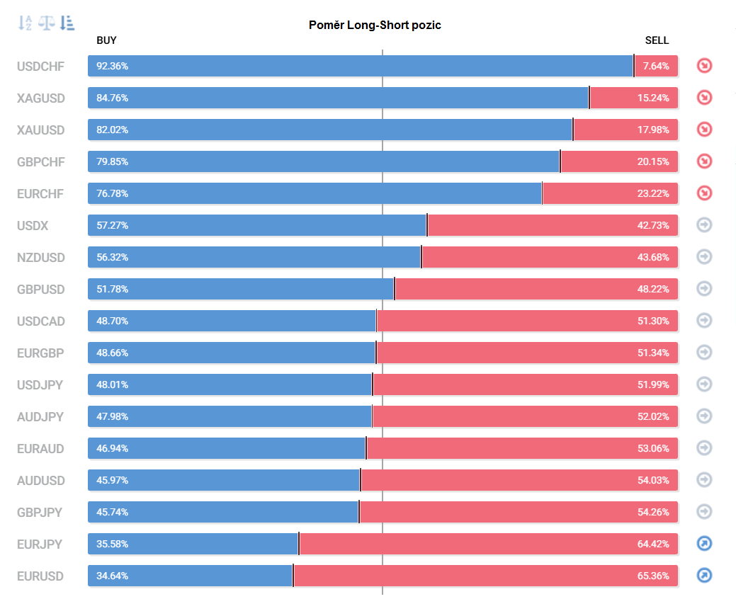 Přinášíme pohled na aktuálně otevřené pozice retailových obchodníků (běžných traderů) na forexu. Jde o reverzní - contrarian indikátor, který pokud naznačuje velkou míru short pozic, tak to může znamenat další pokračování v růstu (a naopak). Je to z důvodu předpokladu, že trh půjde proti retailu, který se většinu času snaží jít proti trendu.
