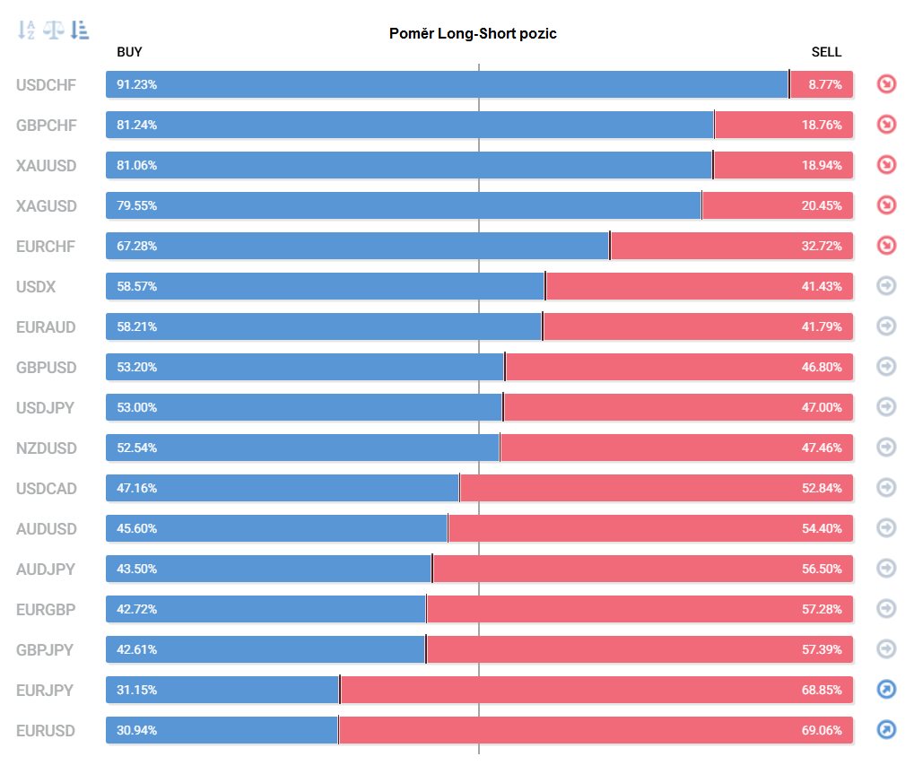 Přinášíme pohled na aktuálně otevřené pozice retailových obchodníků (běžných traderů) na forexu. Jde o reverzní - contrarian indikátor, který pokud naznačuje velkou míru short pozic, tak to může znamenat další pokračování v růstu (a naopak). Je to z důvodu předpokladu, že trh půjde proti retailu, který se většinu času snaží jít proti trendu.