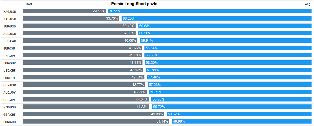 Přinášíme pohled na aktuálně otevřené pozice retailových obchodníků (běžných traderů) na forexu. Jde o reverzní - contrarian indikátor, který pokud naznačuje velkou míru short pozic, tak to může znamenat další pokračování v růstu (a naopak). Je to z důvodu předpokladu, že trh půjde proti retailu, který se většinu času snaží jít proti trendu.