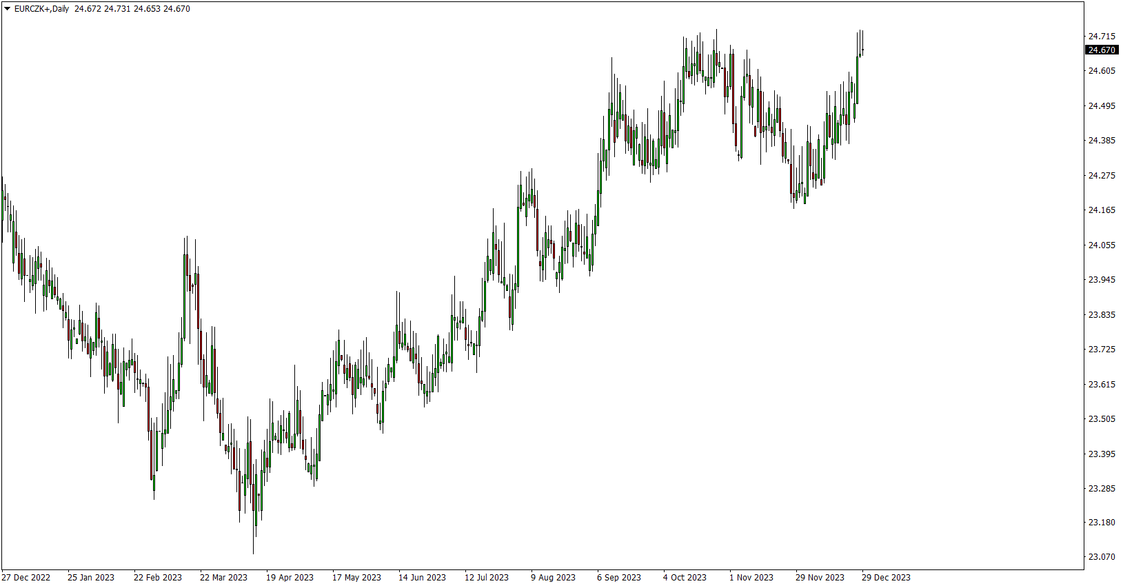 Vývoj měnového páru EUR/CZK (denní graf - D1):