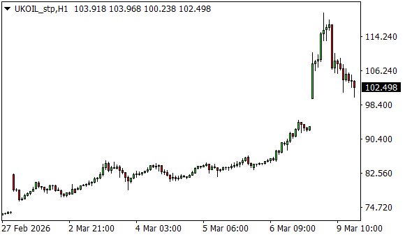 Vývoj ceny ropy Brent (1hodinový graf - H1):