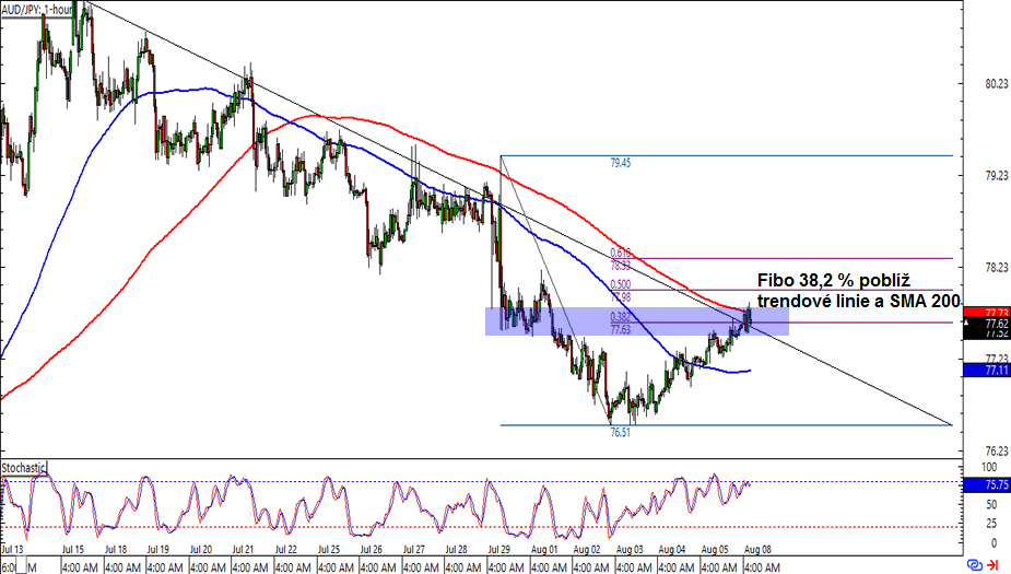 AUD/JPY: Tento měnový pár má potíže s překonáním oblasti 77,75, která leží u hladiny 38,2 % Fibonacciho retracementu na 1hodinovém grafu. Tato oblast je také v souladu s klesající trendovou linií a klouzavým průměrem SMA 200. Bude australský dolar vůči japonskému jenu oslabovat nebo se dočkáme naopak průrazu nad zmíněnou oblast?