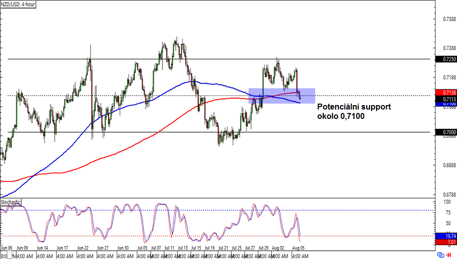 NZD/USD: Tento měnový pár se pohybuje do strany poté, co se odrazil od hladiny kolem 0,7250. NZD/USD aktuálně testuje support uprostřed obchodního pásma nad psychologickou oblastí 0,7100. Indikátor Stochastic zároveň ukazuje přeprodané podmínky. Dočkáme se růstu zpět k maximu obchodního rozpětí nebo cena prolomí support a dojde k otestování spodníma pásma? Pozor na poměr rizika a zisku (RRR), který se nemusí pokaždé v takovýchto situacích vyplatit.