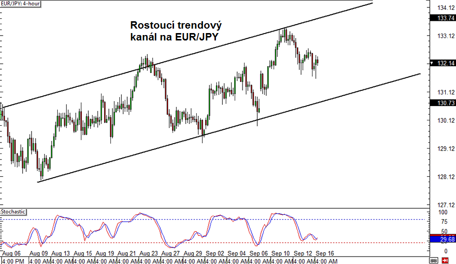 EUR/JPY: Měnový pár EUR/JPY se na 4hodinovém grafu obchoduje uvnitř rostoucího kanálu. Cena zastavila pokles od horní linie kanálu přibližně v jeho polovině. Stochastic stále míří dolů a signalizuje, že by cena mohla ještě otestovat support na spodní linii kanálu. Zde by se mohl EUR/JPY znovu odrazit a pokračovat v růstu.
