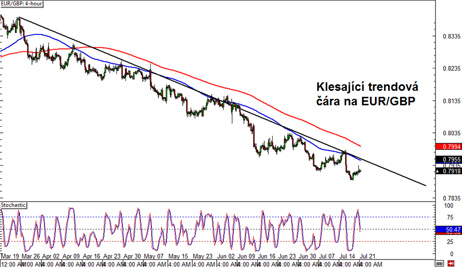 Měnový pár EUR/GBP testuje na 4hodinovém grafu klesající trendovou čáru se začátkem v polovině března... -