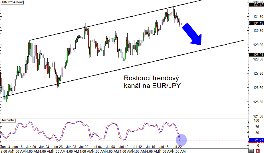 EUR/JPY: Měnový pár EUR/JPY se na 4hodinovém grafu obchoduje v rostoucím trendovém kanálu a po dosažení jeho horní linie (rezistence) se vrací zpět. Situace ovšem není tak jednoznačná. Stochastic je již v přeprodaném pásmu a pokles by mohl brzy skončit. Pokud předpokládáte býčí vývoj, počkejte ještě před vstupem do long pozice na býčí překřížení indikátoru.