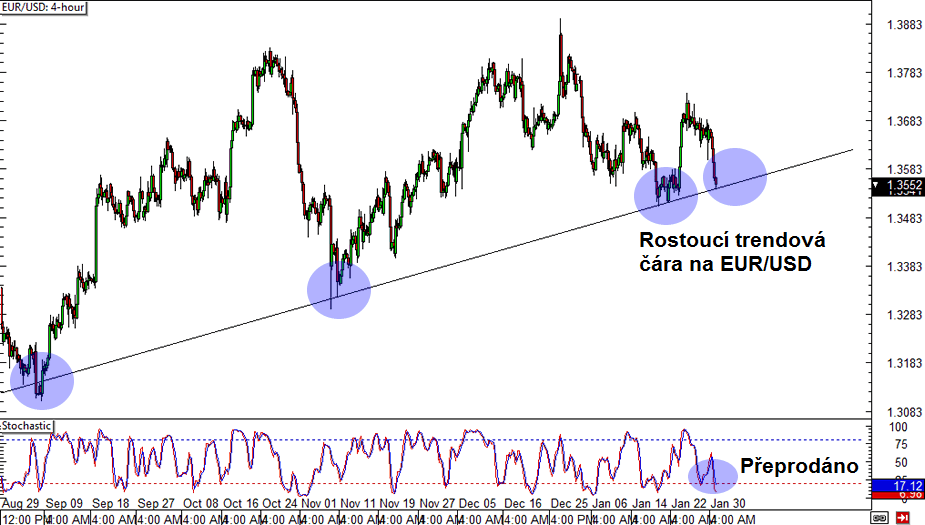 EUR/USD: Měnový pár EUR/USD znovu testuje na 4hodinovém grafu rostoucí trendovou čáru. Odrazí se od ní k dalšímu růstu, nebo ji tentokrát prolomí? Stochastic je téměř v přeprodaném pásmu, ale situace není vůbec jednoznačná!
