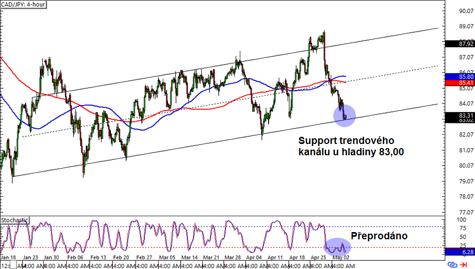CAD/JPY: Měnový pár CAD/JPY našel na 4hodinovém grafu support na důležité psychologické hladině 83,00, což je též na supportu rostoucího trendového kanálu. Stochastic vysílá přeprodaný signál. Jestli věříte v růst k rezistenci tohoto kanálu, tak long pozice na současné úrovni se zdá být jako dobré obchodní nastavení. Nechte ovšem dostatek prostoru pro Stop-Loss pro případ zvýšené volatility.