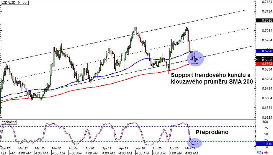 NZD/USD: Tento měnový pár je na 4hodinovém grafu těsně pod hladinou 0,6900, což je u supportu rostoucího trendového kanálu a klouzavého průměru SMA 200. Stochastic je již v přeprodané zóně. Kupci mohou uvažovat o vstupu do long pozice s cílem kolem předcházejících maxim, zatímco prodejci by mohli počkat na prolomení oblasti supportu.