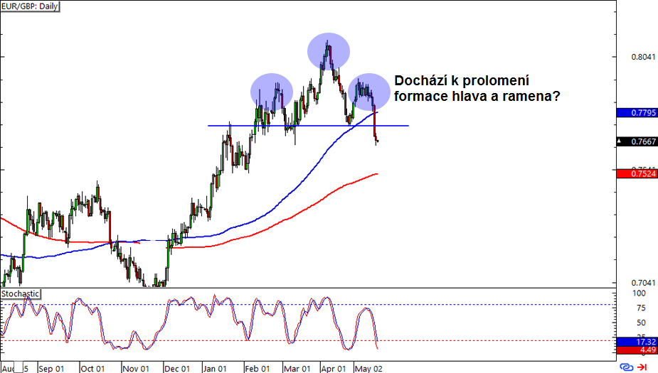 EUR/GBP: Tento měnový pár na denním grafu zřejmě prolomil formaci hlava a ramena. Pokles po prolomení bývá stejně velký, jako je vzdálenost „hlavy“ k linii neckline, v tomto případě asi 350 pipů. Buďte ovšem opatrní, protože důležitý klouzavý průměr SMA 200 není daleko a Stochastic se již brzy dostane do přeprodané zóny. Prodejci mohou uvažovat o short pozici buď nyní nebo po případném otestování prolomené linie neckline (pullback) a jako nejbližší logický cíl se jeví úroveň předcházející rezistence pod hladinou 0,7500. Jestli jste spíš na straně kupců, tak si můžete zakreslit hladiny Fibonacciho retracementu a čekat na růstové momentum, které se případně objeví na těchto hladinách.