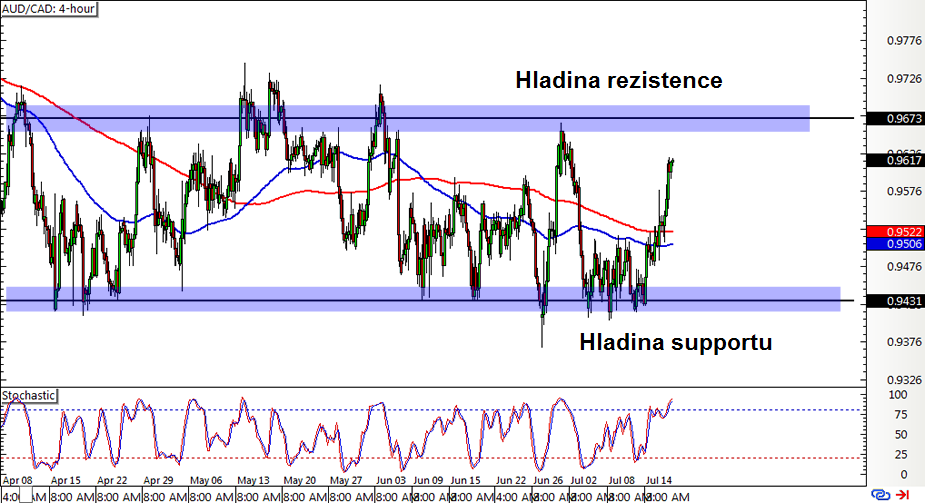 AUD/CAD: Na posledním, tentokrát 4hodinovém grafu, se měnový pár AUD/CAD stále obchoduje uvnitř svého cenového rozpětí. Nedávno se prudce odrazil od supportu 0,9431 a během krátké chvíle je téměř u horní linie (rezistence) rozpětí 0,9675. Nicméně nesmíme přehlédnout, že SMA 100 je pod SMA 200, což signalizuje, že je zde stále medvědí tlak. Stochastic se momentálně dostal do překoupeného pásma a napovídá, že býci pomalu ztrácí energii a medvědi by mohli alespoň na chvíli převzít aktivitu. V tom případě by AUD/CAD zřejmě zůstal u současných hodnot 0,9600, kde je důležitá psychologická rezistence a brzy by se medvědí tlak mohl změnit na výprodej. Jestliže se připravujete na vstup do short pozic, raději počkejte, až se na grafu objeví nějaká reverzní svíčková formace.