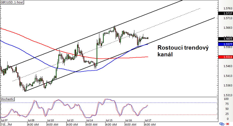 GBP/USD: Na 1hodinovém grafu měnového páru GBP/USD se nám formuje úzký rostoucí trendový kanál. GBP/USD nyní testuje jeho spodní linii poblíž klouzavého průměru SMA 100, který se překřížil nad SMA 200 a signalizuje, že by růst mohl pokračovat. Pokud se tak opravdu stane, potom se zřejmě dočkáme otestování horní linie kanálu v zóně 1,5700 – 1,5750. Stochastic míří nahoru a potvrzuje narůstající býčí tlak. Jestliže ovšem převahu získají medvědi, GBP/USD pravděpodobně prolomí support v pásmu u 1,5570 a bude dál klesat.