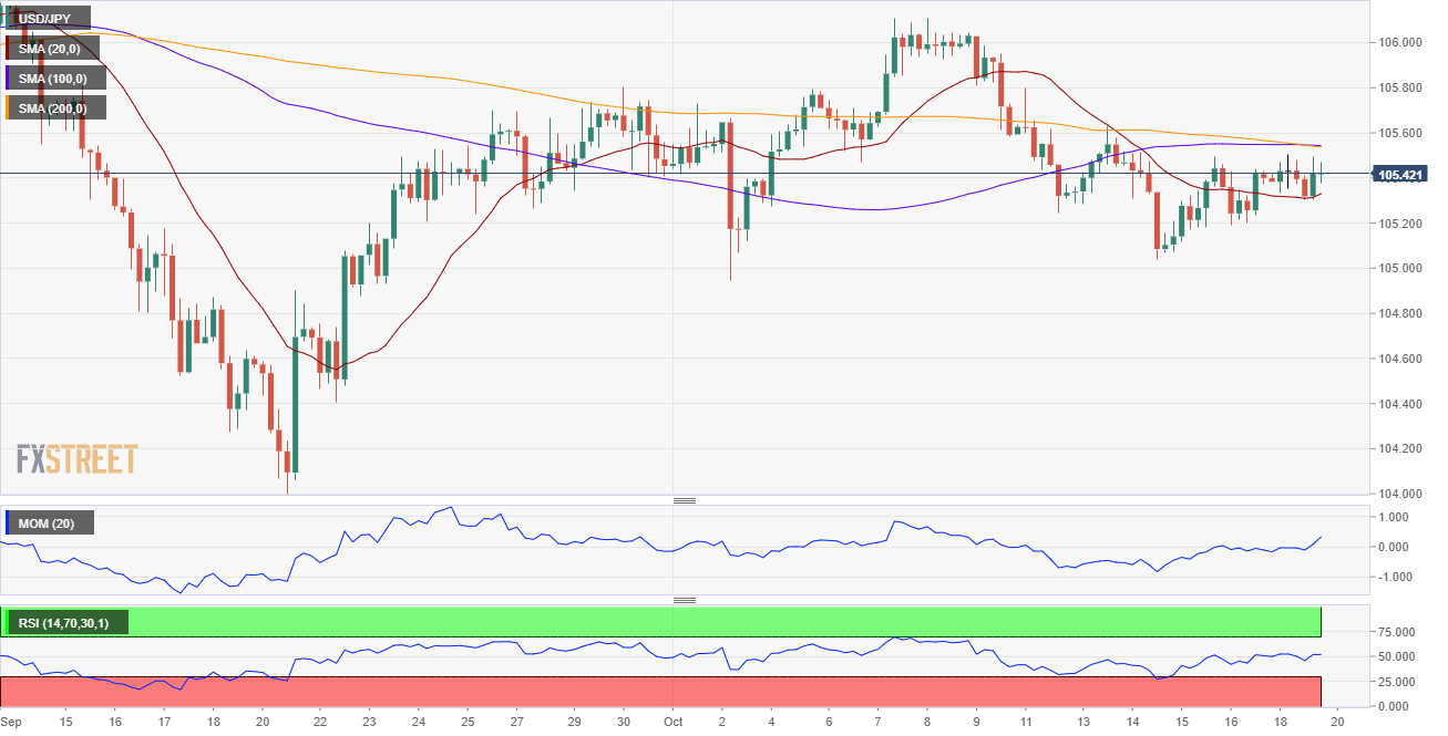 USD/JPY: Tento měnový pár je na 4hodinovém grafu v neutrálním nastavení a obchoduje se bez větší změny již přes dva týdny. Jsme nad klouzavým průměrem SMA 20, ale pod SMA 100 i SMA 200, které konvergují kolem 105,55. Technické indikátory jsou v pozitivní zóně blízko neutrální linie. Obchodní pásmo je mezi 105,00 – 105,80. Pro odhad dalšího směru musíme z tohoto pásma prorazit.