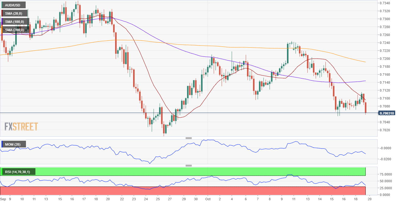 AUD/USD: Tento měnový pár na 4hodinovém grafu včera klesl k 0,7060. Jsme stále v medvědím nastavení, prodejci se objevili kolem silně klesajícího klouzavého průměru SMA 20, který dále klesá pod SMA 100 i SMA 200. Technické indikátory jsou v negativní zóně a míří dolů.