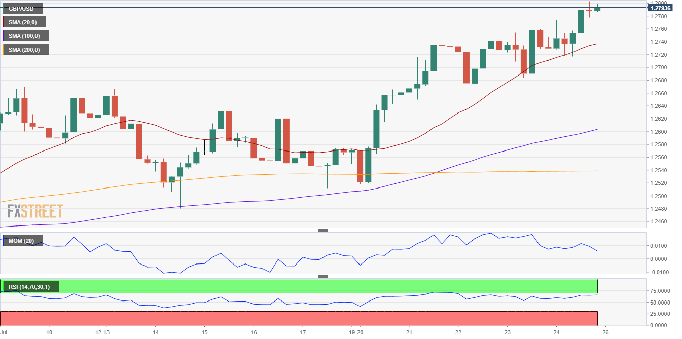 GBP/USD: Tento měnový pár je na denním grafu v býčím nastavení. Cena je nad do strany mířícím klouzavým průměrem SMA 200, SMA 20 roste pod SMA 100 a SMA 200. Technické indikátory jsou v pozitivní zóně. Na 4hodinovém grafu rostoucí SMA 20 poskytuje support, je nyní na 1,2735. Technické indikátory jsou v pozitivní zóně a naznačují nezájem prodejců.