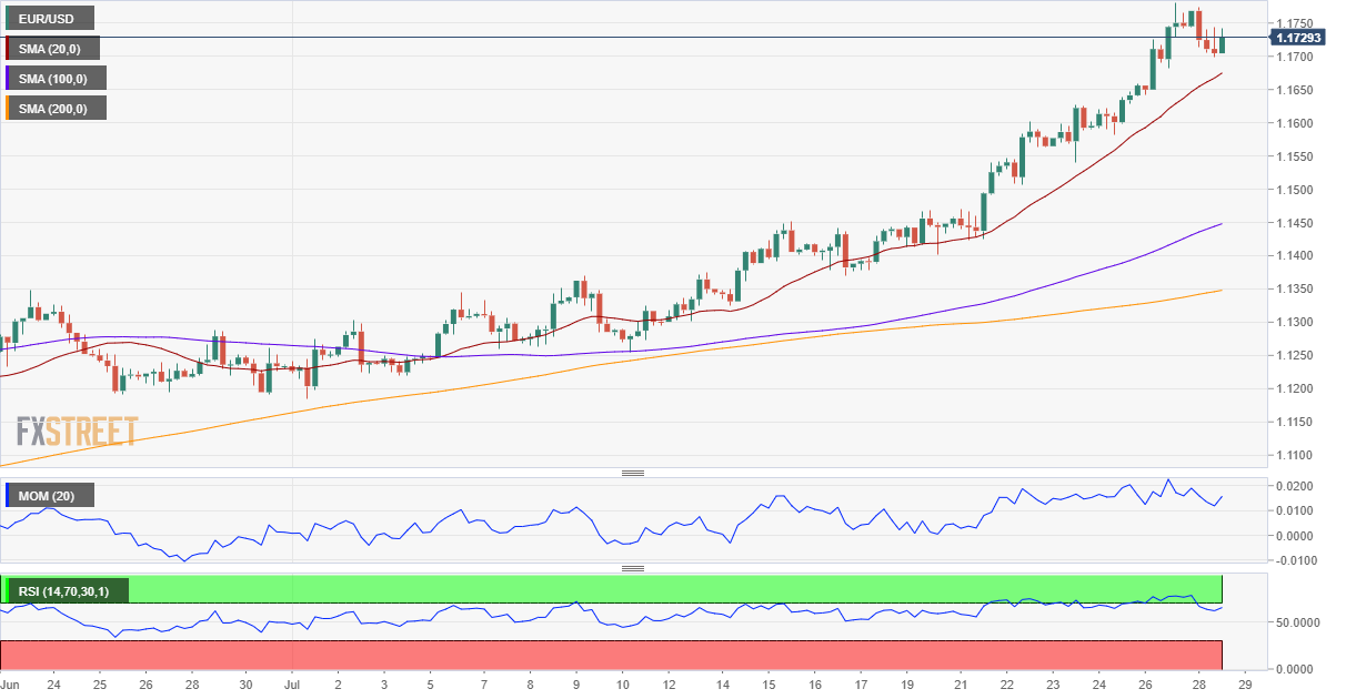 EUR/USD: Tento měnový pár je na 4hodinovém grafu v býčím nastavení, i když ztratil býčí momentum. Cena je nad rychle rostoucím klouzavým průměrem SMA 20, který je dynamickým supportem na 1,1680. Technické indikátory jsou v pozitivní zóně. Po prolomení pod SMA 20 by korekce mohla být výraznější. Na druhé straně po proražení nad 1,1780 bychom mohli dále růst.