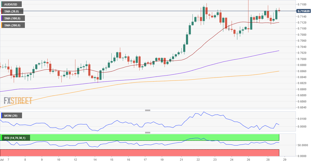 AUD/USD: Tento měnový pár je na 4hodinovém grafu blízko letošních maxim 0,7182, což je rezistence. Krátkodobé očekávání je býčí, jsme nad do strany mířícím klouzavým průměrem SMA 20. SMA 100 i SMA 200 míří vzhůru daleko pod aktuální cenou. Technické indikátory jsou v pozitivní zóně, ale míří do strany.