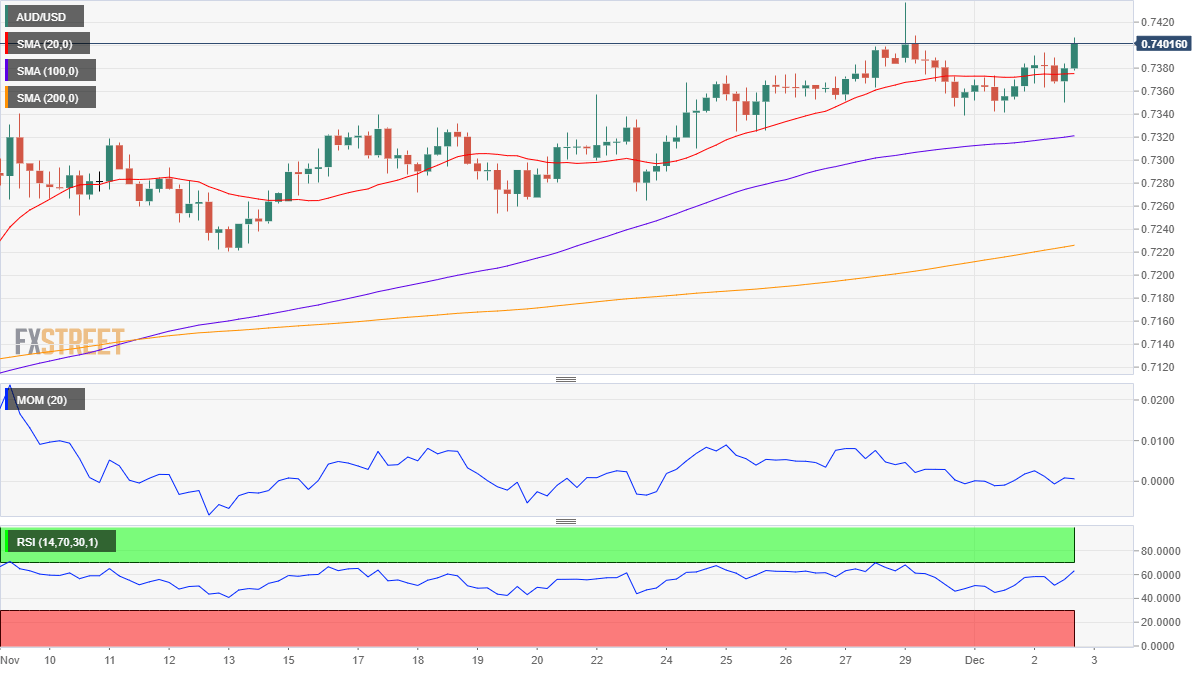 AUD/USD: Tento měnový pár je na 4hodinovém grafu v neutrálním nastavení, ale roste býčí potenciál. Včera jsme obchodovali kolem klouzavého průměru SMA 20 a nyní jsme nad ním. Technické indikátory jsou v pozitivní zóně, ale nemají jasné momentum. Pro získání dalšího býčího momenta a možné otestování hladiny 0,7500 musíme překonat letošní maxima 0,7413.